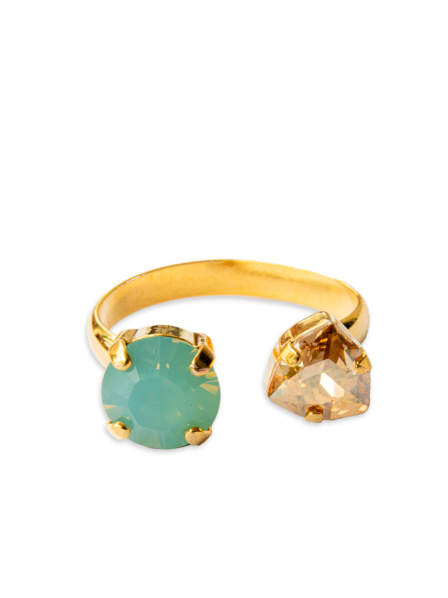 טבעת פתוחה עם שני קריסטלים בגזירה ייחודית, היוצרים שילוב מפתיע ומעודן: עיגול רך לצד משולש חד, בצבעים שמשתלבים בהרמוניה – תכול פסיפיק אופל ושמפניה חמה בנגיעה זהובה, טבעת שמספרת סיפור של ניגודים משלימים – עוצמה ורוך, מינימליזם ואמירה. מושלמת ליצירת לוק מעודכן ביום־יום או כתכשיט שמאיר הופעה בערב.