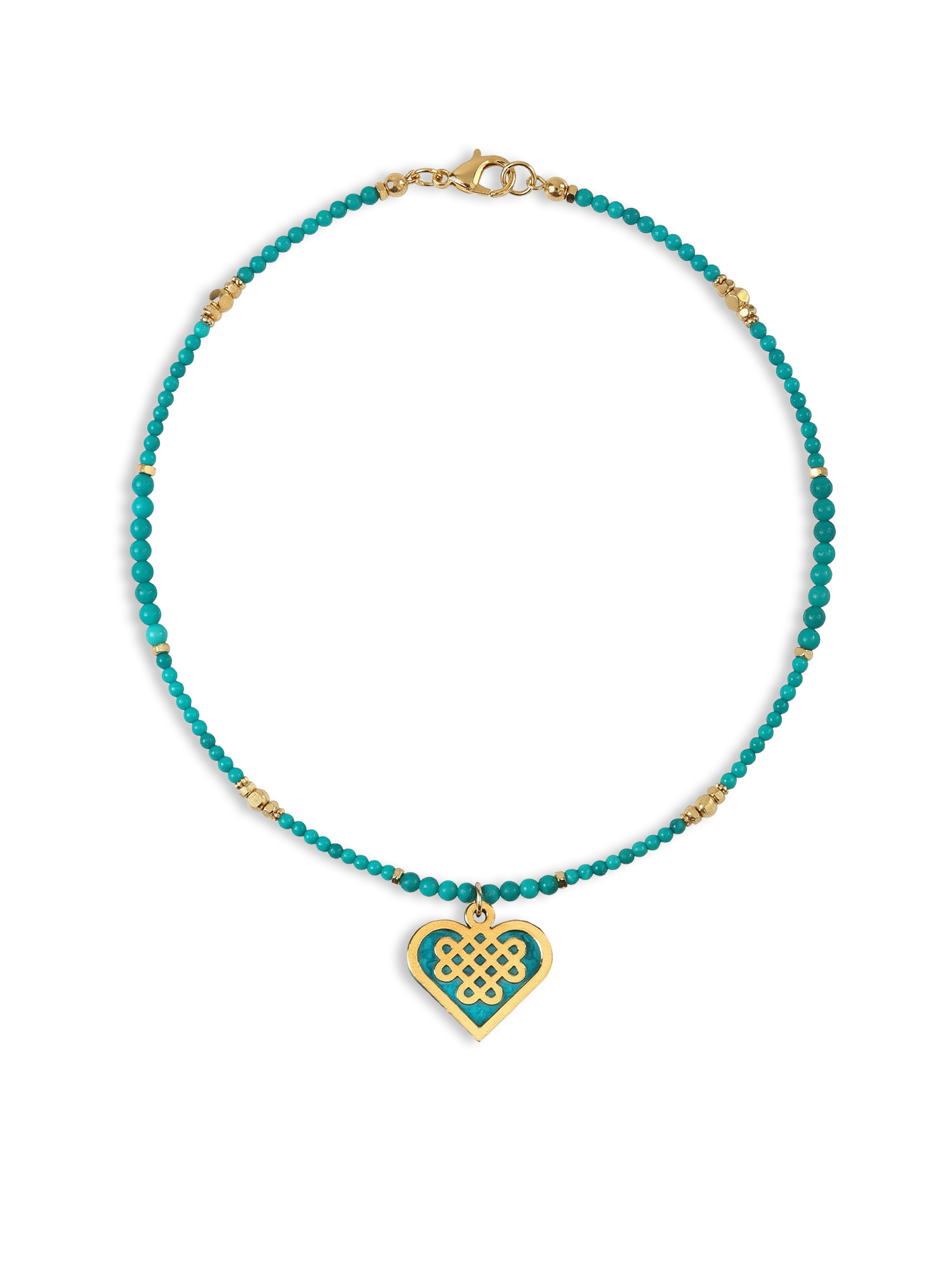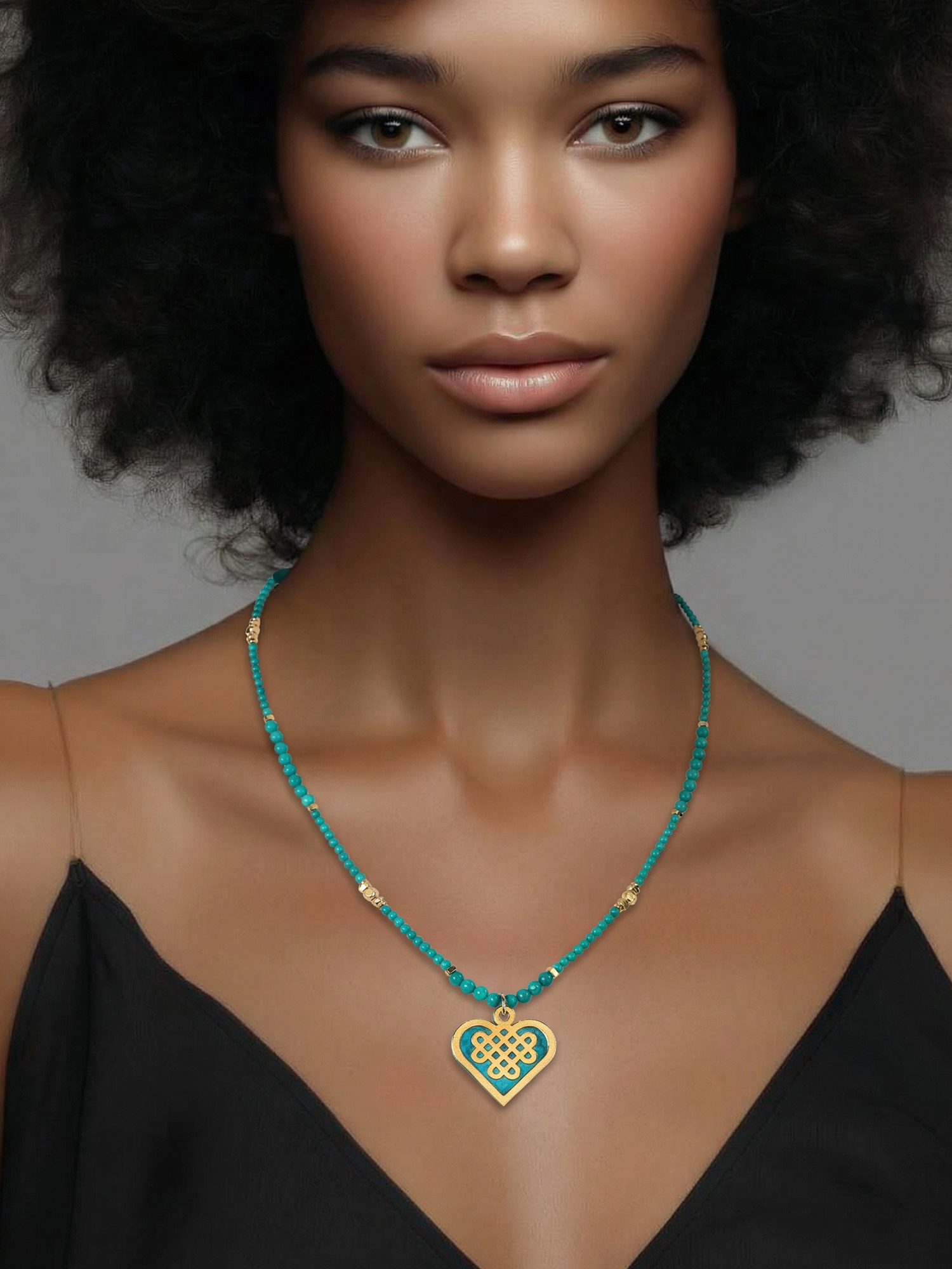 השרשרת משלבת אבני טורקיז טבעיות, הידועות כאבני ריפוי, הגנה ופתיחת הלב, יחד עם תליון לב גאומטרי מוזהב בעיצוב מיוחד המדמה מסלול אינסופי. קווי הזהב המשתלבים זה בזה יוצרים סמל של חיבור, הרמוניה ושלמות פנימית.